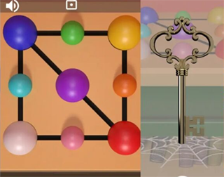 15、后退右转三次,对镜子下面的盒子放上四颗球,规则是两边大球颜色等于中间小球颜色,获得通关钥匙。左转两次对门用通关钥匙进入,根据之前从上往下的颜色提示可知打开的门颜色顺序为黄橙红紫蓝,逃脱完毕。