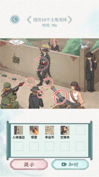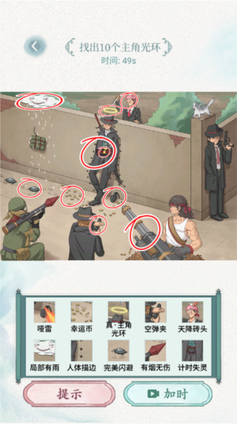 3、然后在这里我们要在规定时间内找出10个主角光环,以下用红圈圈出来的便是小编找出来的主角光环。