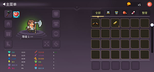7、拾取的物品和装备都会出现在背包里,点击右上角的背包,选择斧头,点击装备,就可以去砍树啦~