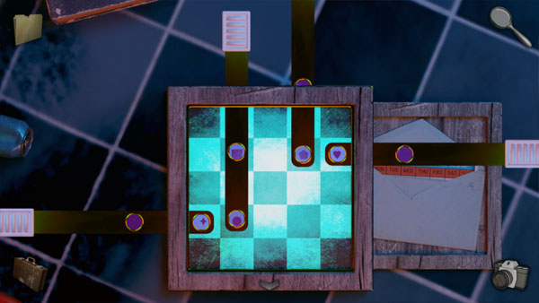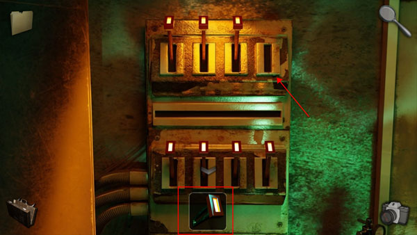 5、进入走廊将穿孔卡放在窗户上观察打孔位置标注的七个符号,然后点击右侧的控制器点亮对应的符号打开铁门。