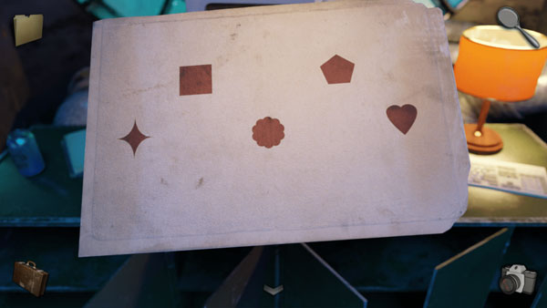 3、打开电脑桌左侧柜子观察里面的纸条(上面的几何图形),然后点击地上的机关盒进行调整(如上图)拿到穿孔卡。