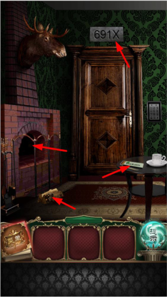 4、第四关,这里我们需要把左边火炉处的木柴,然后在右边的桌子上拿到火柴,把木柴放入左边的火炉中,再用火柴点燃,我们看到火炉壁上有一个4,密码为6914,打开门进入第五关。