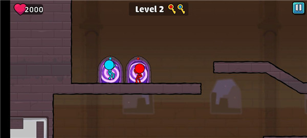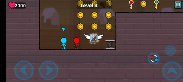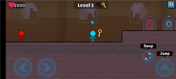 3、只需轻触交换按钮,即可从蓝色火柴人变为红色火柴人,反之亦然尽可能多地收集宝石。