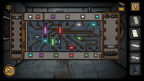 17.成功后机轮室右边的们开了,搜大厨尸体,开左上盒子拿灯泡,左转拿海盗外套,钥匙开抽屉,拿锯子,调查左上的锅具。上楼梯锯子开门,回到最初游戏开始的房间(主角出生点),卸下螺丝,先在左下方空缺位置放上灯泡,解密才能开始,灯泡全部放置成功后,进门。(下图中剩下的长灯泡放长红灯泡右边,剩下的短灯泡放短红右边,实际上就是打通上四到下六这个通路。)