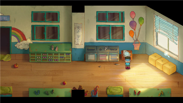 第一章,《静悄悄》,从一个固定位置的男老师上方的玩偶往右走,进入隐藏空间调查墨镜;
