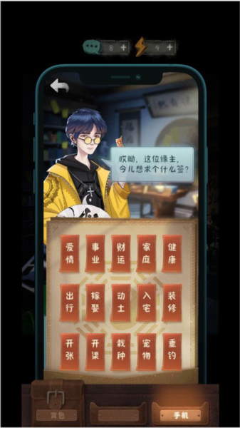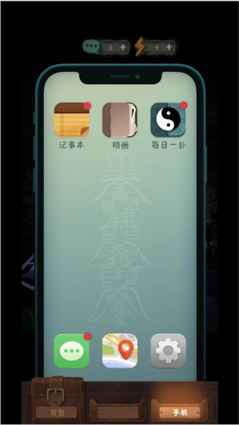 2、打开手机,玩家可查看记事本、每日一卦和缘主聊天信息