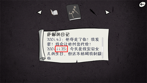 7.点击右上角收集品,查看【萨佩的日记】,找到女儿的生日11.25。