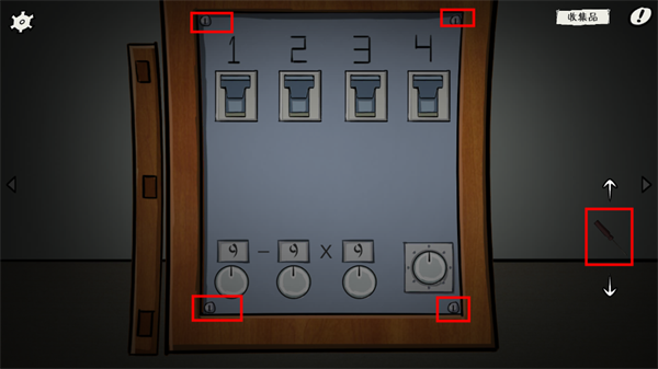 10.按照【卡片】上的数字顺序,依次拨下序号3、1、4、2开关(首先通过点击算式下的三个按钮,使算式的答案为需要的数字,多次点击最右边按钮,直到中心绿点变红,拨下对应序号的开关,直到拨下所有开关,其中一组正确数字为7、2、2 ▏5、2、2 ▏8、2、2 ▏6、2、2),使报警装置断电。