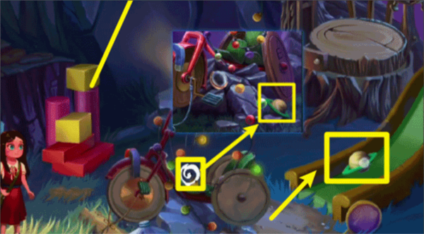 14、将加热垫给冰人用,点击滚落的自行车,得知需要强大的磁铁,点击滑梯旁的升降机,得知需要紫色灯泡,绿色灯泡和红色灯泡。