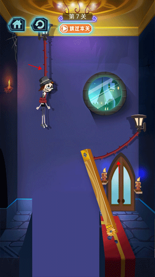 5、等到了第七关,难度再次提升,需要想将木板的绳子割断,让火柴先生安全到落到板子上才能逃生,玩法非常有趣。