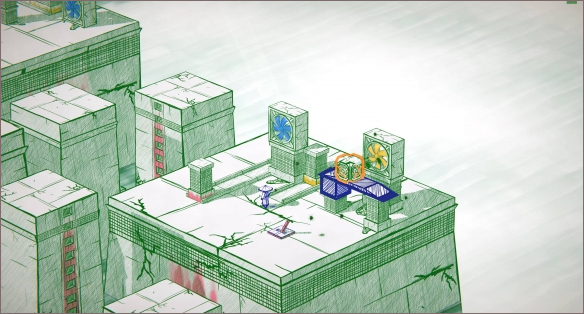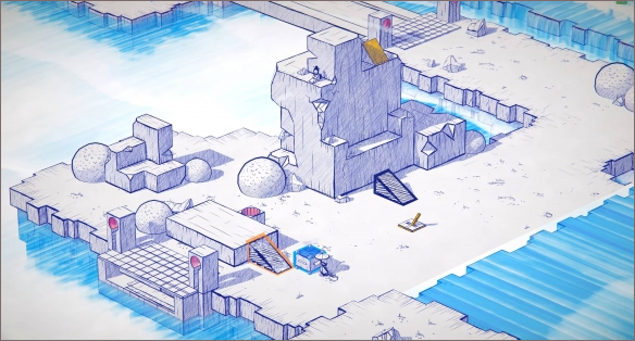 在每个场景中游戏都会将谜题设置好,玩家要做的是开动脑筋寻找解开谜题的正确方法,或是挪动箱子,或是拉动操控杆,其中最具特色的,还是控制无名英雄拿起钢笔,选中场景中可以绘制的物品并将它们放置到合适的位置来触发机关,开辟出一条通往下一场景的道路。