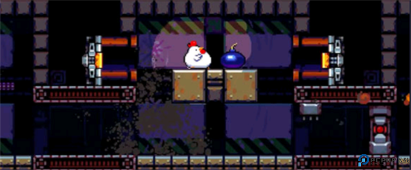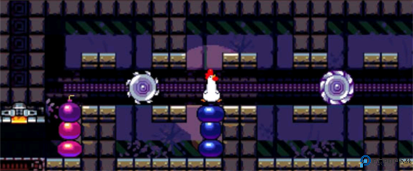 当鸡站在二楼时,放一个炸弹让传送带将其送下去,炸掉下面的石墙。