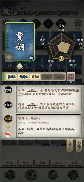 四、进阶介绍每个武将可以通过功勋升阶为中郎将、主将,升阶中郎将需要100功勋,而升阶主将需要3000功勋,功勋获取又极其有限,因此主将升阶的选择就存在优先级。