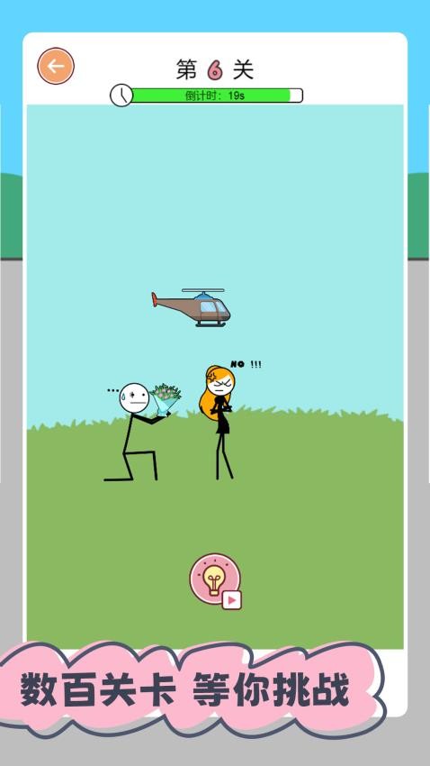 画面的角色都是火柴人造型,让玩家可以控制火柴人挑战不同的关卡,让两个火柴人完成求婚操作。
