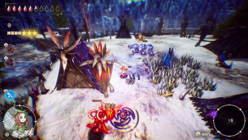 采用标志性HD-2D风格,将精致像素角色与3D化场景、光影结合,打造出复古又现代的视觉体验。固定俯视视角搭配景深表现,角色动作流畅,场景细节丰富,火焰、魔法等特效贴合奇幻主题,既保留像素质感,又通过光影营造出沉浸式冒险氛围。
