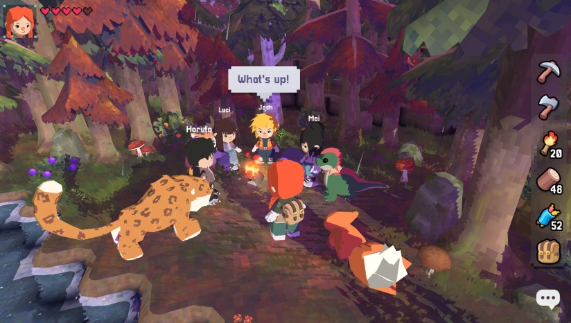 游戏采用像素图形风格,以色彩鲜明、设计可爱的画风呈现开放世界。这种视觉风格与游戏温馨的基调相得益彰,虽然不是追求写实效果,但通过细腻的像素艺术和动漫元素,营造出独特且吸引人的视觉魅力。世界设计注重细节,为玩家提供丰富多样的探索场景。