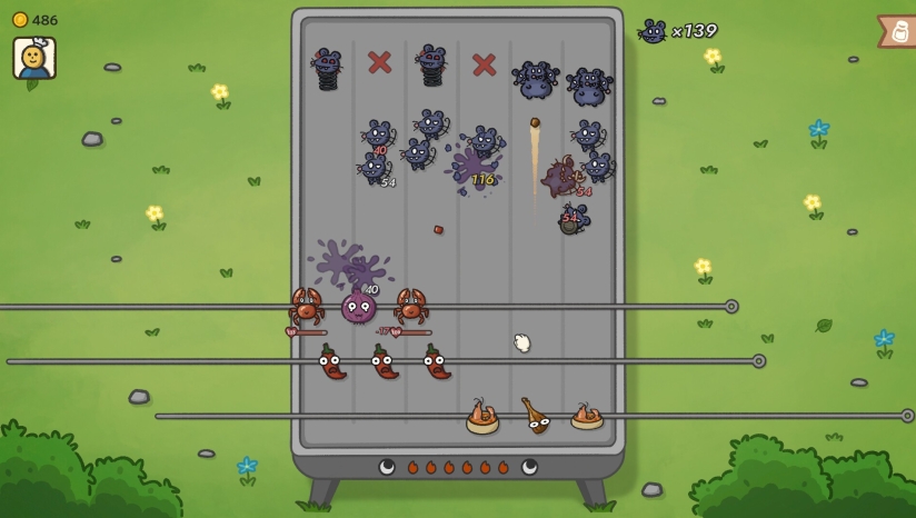 本作核心玩法融合了塔防策略与肉鸽随机要素。游戏采用3×3九宫格布局的烤炉战场,玩家需在三根烤签上串起食材,组成最多9个单位的防御阵容,抵挡六路进攻的鼠群。与传统塔防不同,玩家可实时拖拽烤签,让食材瞬间支援各路,操作体验类似桌上足球,带来极高的操作自由度。每波战斗结束后,玩家进入商店阶段,使用金币购买新食材、升级品质或选择提供被动效果的调料。游戏包含24位天赋各异的烤串师傅、49种食材和135种调味剂,玩家需要根据所选师傅的特性构建专属流派。通关基础关卡后还可解锁无尽模式,供追求极限的玩家挑战更高轮次。