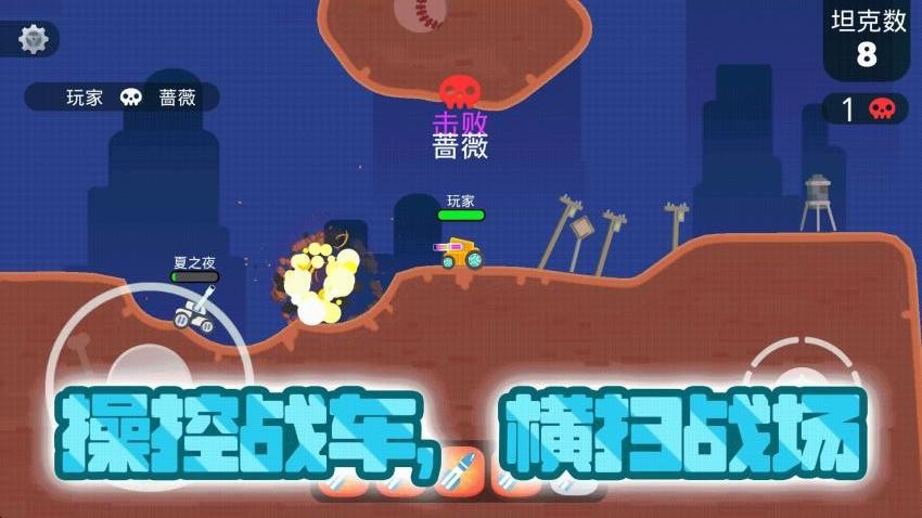 1、虚拟摇杆操控坦克移动,也要利用瞄准镜锁定敌方目标发起猛烈攻击。