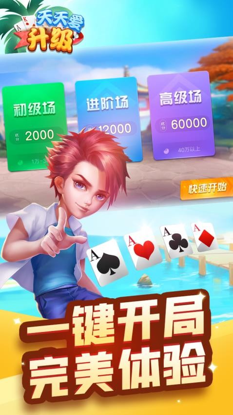1、天天爱升级手游玩法简单,可以在游戏随时启动新的对局,成功匹配玩家就显示牌桌界面。