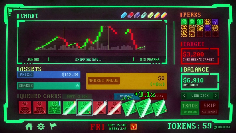 游戏核心是卡牌驱动的市场操控系统。玩家通过打出卡牌来直接影响贯穿整局的共享股价,推高价格能打开新机会,但无节制的上涨会增加波动性,使崩盘更容易发生。游戏包含12种卡牌类型与超过120张可收集卡牌,玩家需要通过新增卡牌、移除卡牌来强化核心卡组。爆炸连携机制是游戏的特色之一:卡牌分属不同类型,同一回合打出多张同类型卡牌会触发连携效果。合理的出牌顺序与牌组构筑能把小手牌打成爆发回合。游戏提供50种增益,其中包含带来高风险代价的“诅咒增益”,玩家可以打造强力联动,或孤注一掷走高风险策略。正式版还将提供6个难度等级,既适合休闲玩家,也能满足硬核策略玩家。