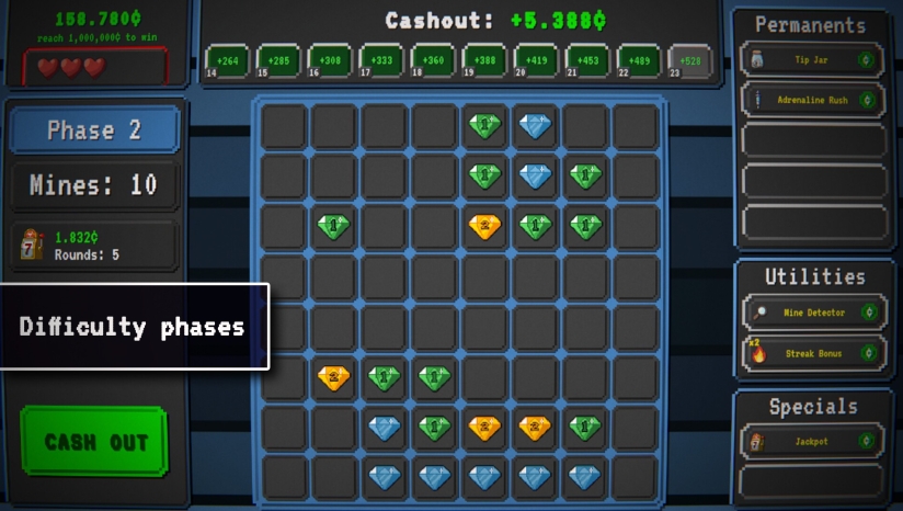 《Coinsweeper》是一款结合了经典扫雷者、风险管理、卡组构建和赌博机制的类Roguelite游戏,其核心机制基于扫雷逻辑,但目标并非完全清除棋盘,而是通过策略性揭示方块来积累金币,并需在风险与收益之间做出抉择。