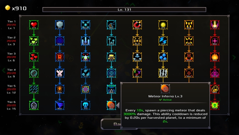 《Arcadium - Space Odyssey》最突出的特色是其无限的重复可玩性。程序生成的宇宙包含了行星、恒星、黑洞、外星生物和各种宇宙奇观,与传统静态或重复的地图截然不同。游戏内拥有数百种通过天赋、物品、文物等获得的不同能力,这些能力可以完全改变游戏玩法,玩家可以实验无数种协同效应,释放自己独特的游戏风格。