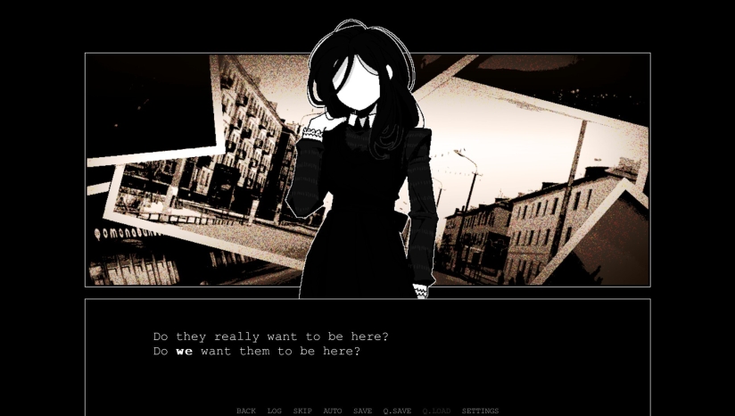 《Z.A.T.O.》采用低保真度视觉风格,画面充满噪点和杂色,刻意营造出陈旧档案般的质感。背景图片占据屏幕中心较小区域,角色立绘则站在背景"外面",形成独特的构图。游戏只有7张CG和5个角色立绘,但通过灵动的表情差分使每个角色形象鲜明。空镜头场景呈现高对比度、充满噪点的特点,符合所谓"保密画质"的时代感,与《地铁》《潜行者》等作品有着相似的美学基调。