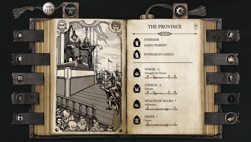 本作的核心玩法是以选项驱动的互动视觉小说形式展开,融合了角色养成与多线叙事。玩家在主角人生的不同阶段面临大量抉择,这些选择会提升或降低“决心”“感知”“意志力”等属性,并影响人际关系。游戏包含独特的“虚亡”系统:主角前三次死亡并非终结,而是保留经验重新开始的机会。最终剧情会收束至三大主线——成为贵族法官、加入宗教裁决所,或投身平民革命,每条路线又有多个结局分支,完整体验需至少20小时。