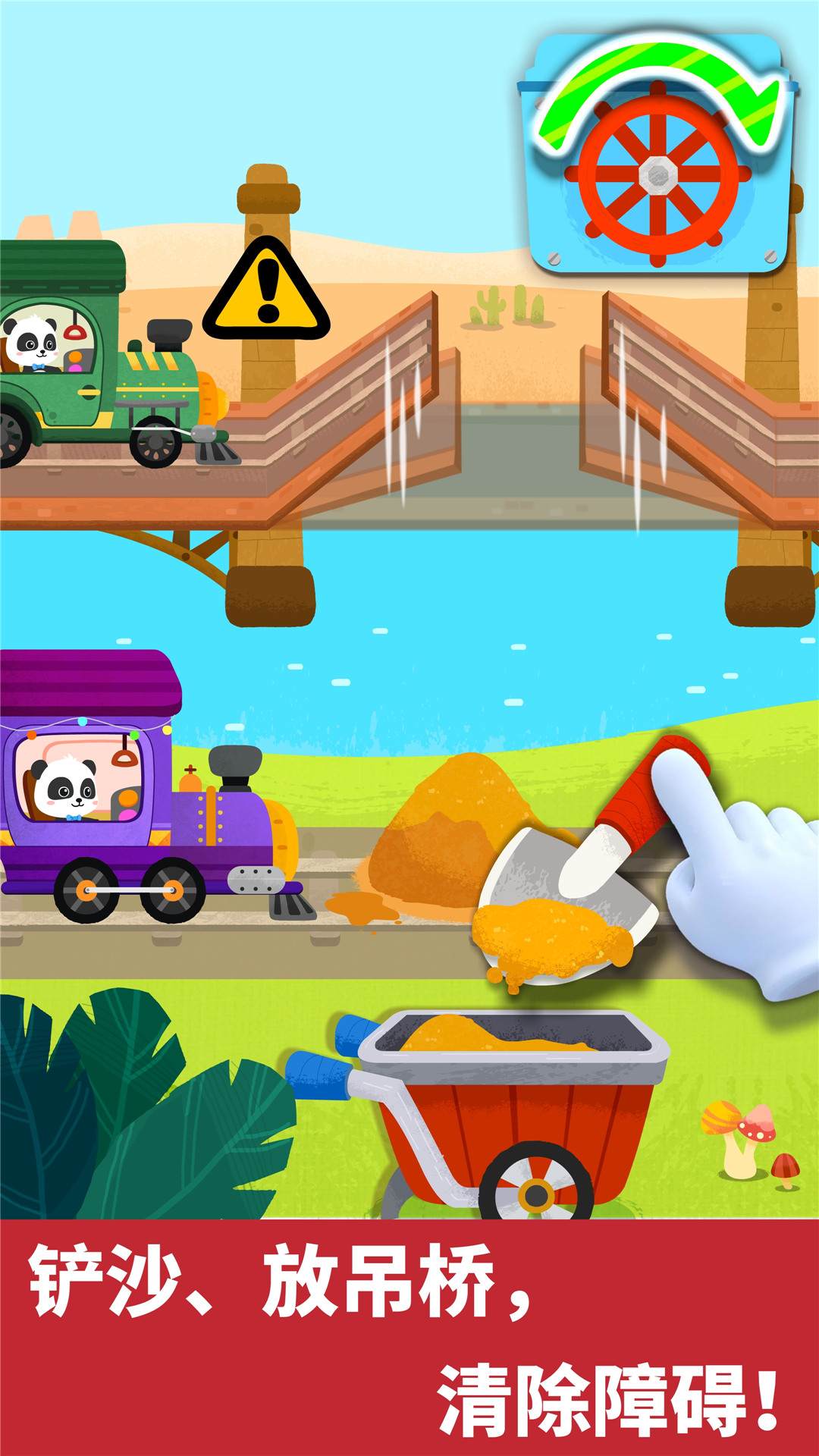 小火车遇到困难了。宝宝快发挥聪明才智,放下闸栏、清理铁路、修好铁轨,让火车行驶顺畅!