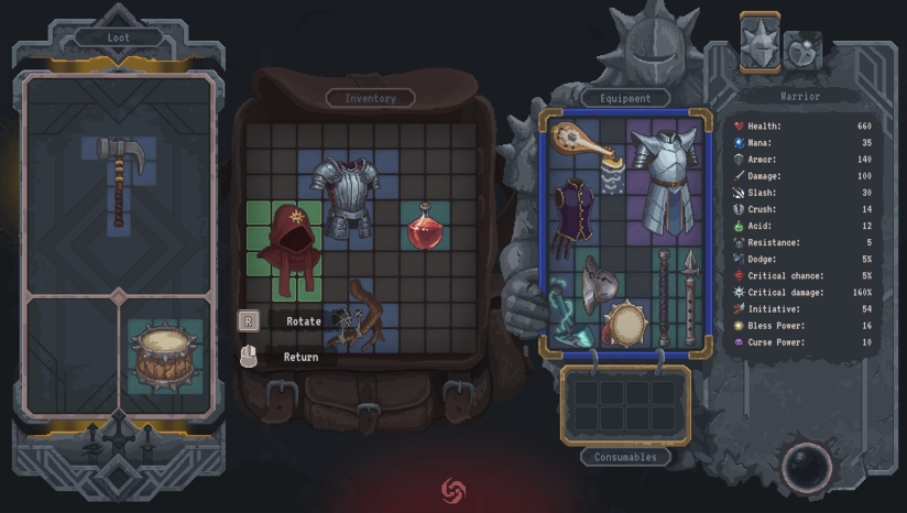 本作是一款融合了回合制战斗、深度库存管理与队伍建设的战术Roguelike游戏。玩家需要在主中心精心准备每次冒险,包括组建四人小队、装备英雄及优化库存布局。游戏采用程序生成的地下城系统,每次探险地图都会随机生成,战争迷雾机制遮蔽未知区域,使得每次探索都充满变数与惊喜。战斗系统采用回合制策略设计,技能释放受行动点限制,要求玩家在每一步操作中权衡资源消耗与战场收益。独特的命运骰子机制在每次冒险开始前启动,玩家需要掷出D10、D12和D20三种骰子,这些掷骰结果将为整个探险旅程赋予独特的增益、减益和游戏修改器。玩家还需要在有限的背包空间内管理战利品,平衡战斗力与探索收益的关系。