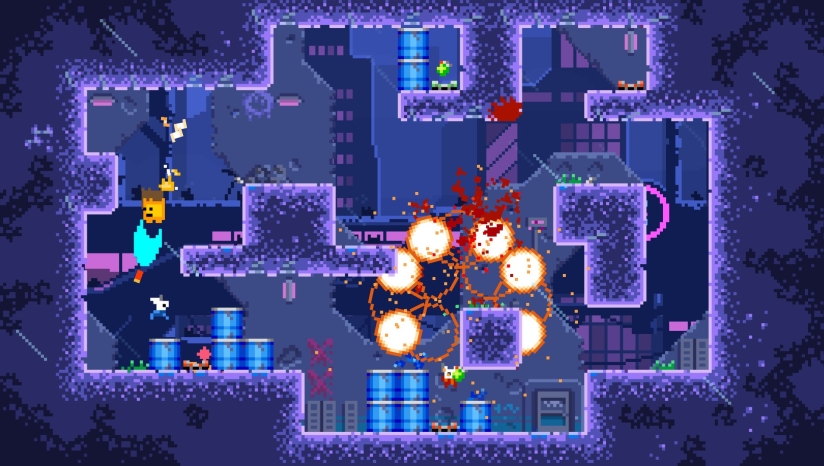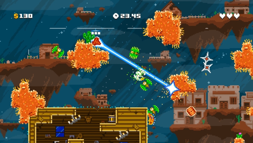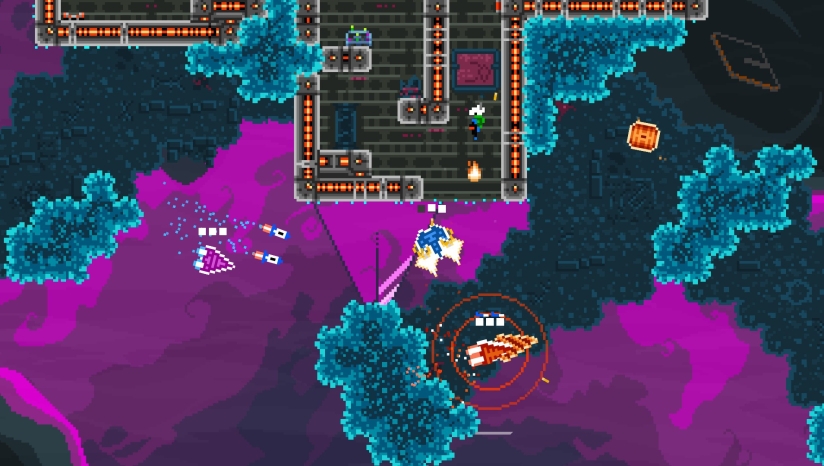 空战与地战自由切换:玩家驾驶纳米战斗机在太空中进行俯视射击,一旦进入重力区域,飞船会被自动回收,角色出舱后立即转入2D平台动作模式,在地面使用近战武器或枪械继续战斗。