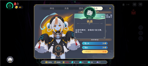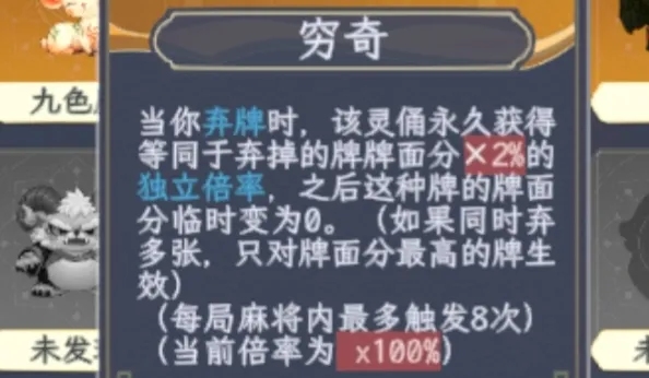 加底分,加倍率,加番数,改牌,加胡牌次数 打钱,往牌库里面塞牌,生成额外的道具,染宝牌,甚至在一定程度上改变做牌策略,很大程度上一局游戏灵俑的质量会决定这局是爽局还是痛局,灵俑带来的另一个重点是得分的另一维度成长:独立倍率。