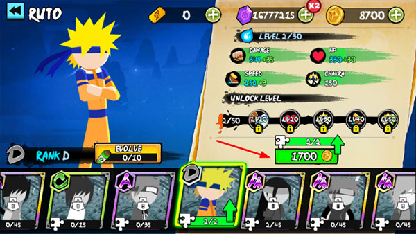 在角色列表中选择任意忍者,详细属性一目了然,点击Upgrade即可开启强化流程。