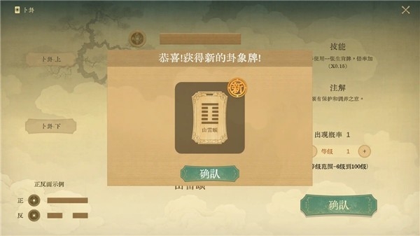 3、64张卦象牌,对应《易经》六十四卦,提供增命数、加倍率、改规则等强力效果。