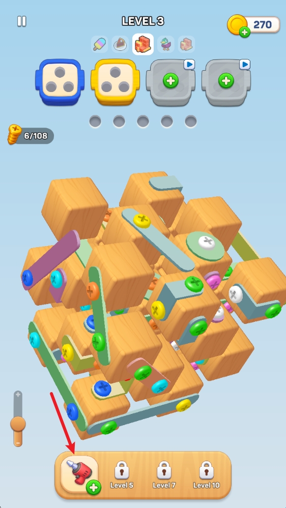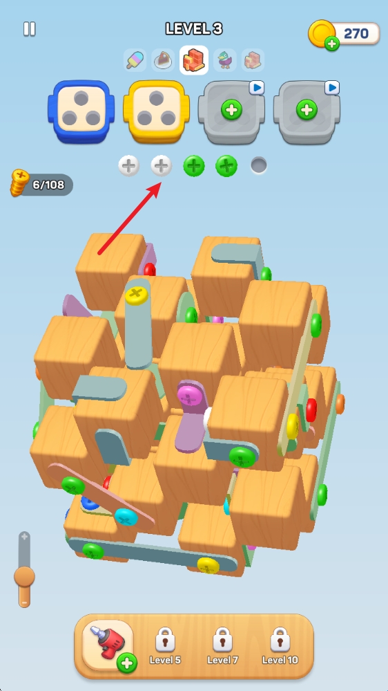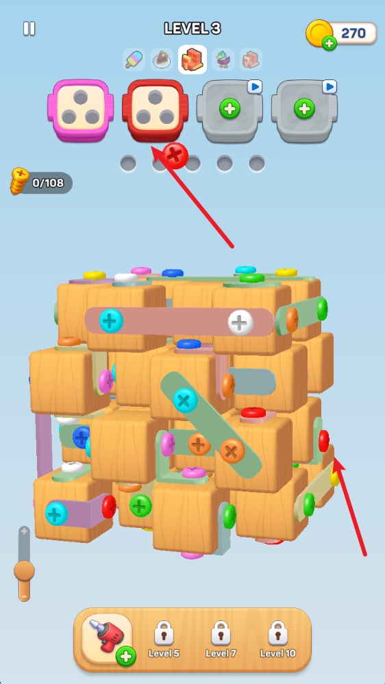 1、玩法十分简单,通过点击螺丝即可将其放入上方对应颜色的盒子中。