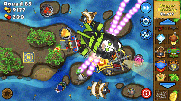 分别建造皇家飞行员、超人猴子、魔法猴子、猴子村和香蕉工厂。其中,猴子村能向防御塔提供各种补给,但是比较贵,香蕉农场能每关定时提供值钱的香蕉,价格也高。