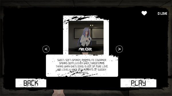 病娇女孩恐怖游戏破解版是一款冒险类游戏。游戏采用顶尖的3D引擎制作,精致的场景以及角色建模为玩家大大提升了游玩的沉浸感。玩家将以第一人称的视角扮演主角,尝试在无人的办公室中躲避米拉前辈的追杀。游戏的核心是躲避病娇女孩的追杀,而玩家需要利用办公室中各种掩体来进行躲藏,并且发出的任何声音都将增加被发现的风险。