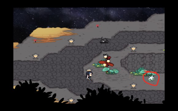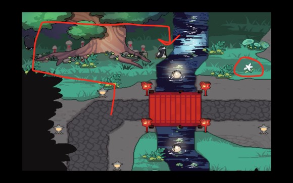 然后镜再一次回到了山脚,同时在如图所示的位置会刷新第一只可以互动的npc,也就是我们后续也会遇到的商人,个人感觉这个小妖精很可爱的,目前他会卖止血草,不过现在肯定是用不上啦。