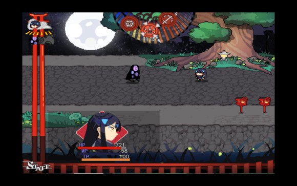 然后进入下一个场景会进入第一场战斗,并获得初始武器——村里最好的水管和一件衣服并装备(别想着脱衣服人物贴图也会变这样的小聪明噢)同时附上新手教程如下,至此游戏所有新手导引元素结束。战斗具体不难,依靠方向键切换轮盘选择行动方式即可,攻击就是老老实实打一下,牵扯魔法和治疗的术式和特技会在以后解锁,分别消耗人物的MP(蓝槽)和TP(黄槽),顾名思义,后者可以通过受击和攻击回复。