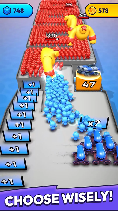 1、让玩家控制蓝色火柴人与电脑展开对抗,同时加入了倍增门槛,让兵力产生的过程更加充满意外;