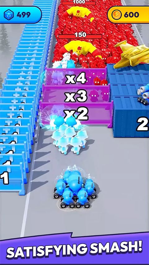 2、按住大炮不松手就可以源源不断地发射出炮弹人,炮弹人经过倍数门会获得数量上的增长,建议朝着倍数较高的门发射。