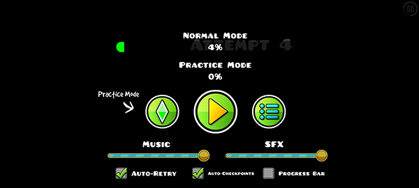 4、新手推荐先从前几关节奏较慢、障碍清晰的关卡熟悉跳跃手感,了解各种地形机制(如三角刺、翻转地面、传送门等)。