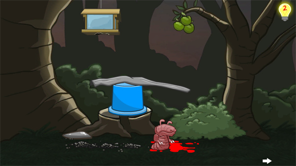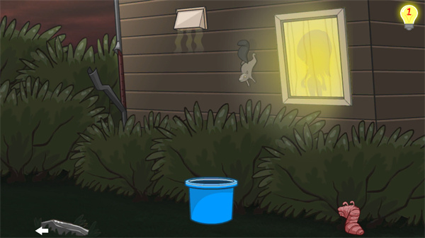 场景1:打开木箱,取出铁锤,敲掉垃圾桶左端的木桩,点击垃圾桶,让臭鼬撞到垃圾桶,拔掉电灯底座的插头,将插头连接在除草机上,此时点击绿色按钮,除草剂发出噪音吓走臭鼬,点击垃圾让异形虫进入垃圾,关掉除草机,臭鼬返回吃垃圾,死亡。