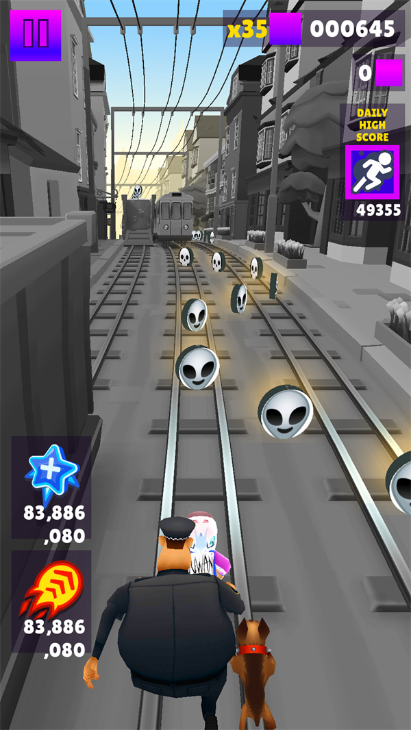 地铁跑酷雾挽仿外网版是将超热门的游戏《地铁跑酷》进行魔改创作得到的全新版本,你是否已经厌倦了原版那始终不变的地图和各种UI,那熟悉的角色不再能让你提起激情,那么就来这个版本来体验焕然一新的地铁战吧,在这里你所认识的金币变成了外星人的样子,整个地铁站更是充满了赛博朋克的科幻气息,是否能唤醒你那沉寂已久的跑酷之心呢?