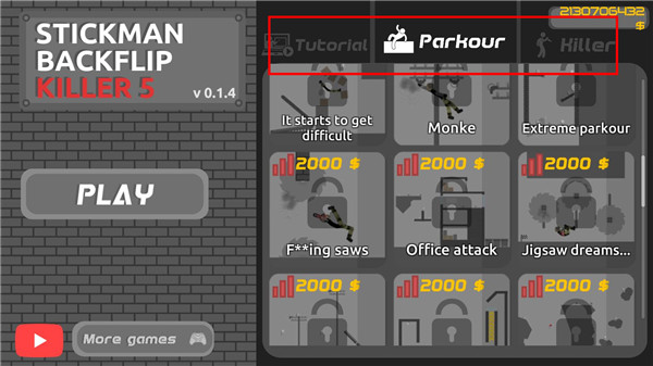 1、下载并安装本站提供的火柴人后空翻5,打开进入游戏点击左边PLAY”按钮,选择右边选择模式。