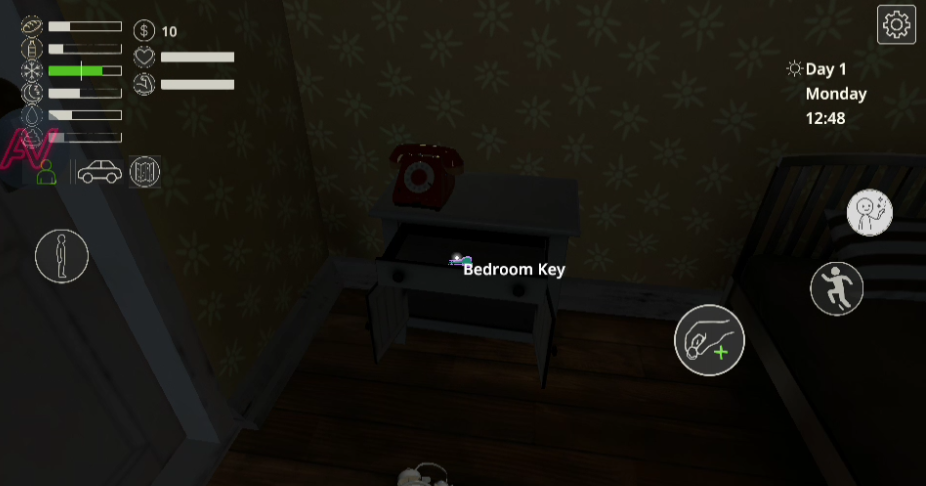 2、床的左边柜子里放着把钥匙,试试打开房门出门。