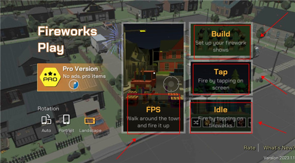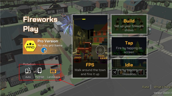 1、打开游戏该界面后,点击这里可以切换游戏的横屏与竖屏模式,以不同角度去欣赏烟花。