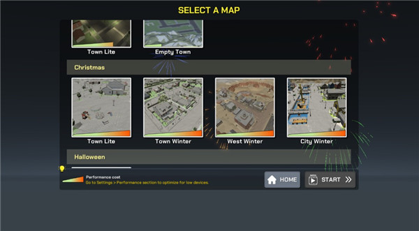 3、进入模式后,这里我们可以上下滑动,选择不同的地图去放烟花,选择好后点击start即可进入。