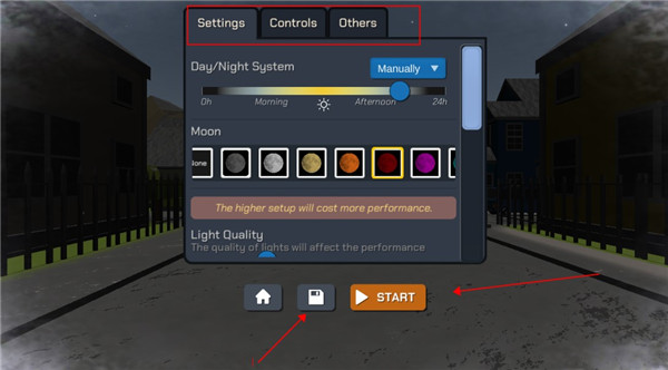 4、进入后会弹出一个设置,我们可以在此设置月亮颜色、地图日间夜间的时间、控制的灵敏度、还有烟花发射保障产生的振动等等,当我们设置好后,还可以点击下面的存储按键,保存下来,这样后面就不同再次手动调整了。