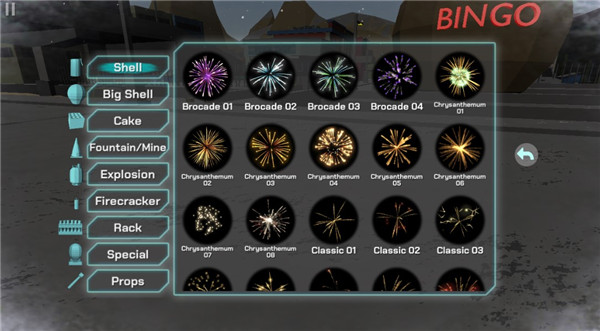 炮弹种类:锦缎、菊花、经典、十字炮、大丽花、幽灵炮弹、马尾炮、频闪炮、礼炮、柳树炮、彗星炮、喷泉炮、地雷。